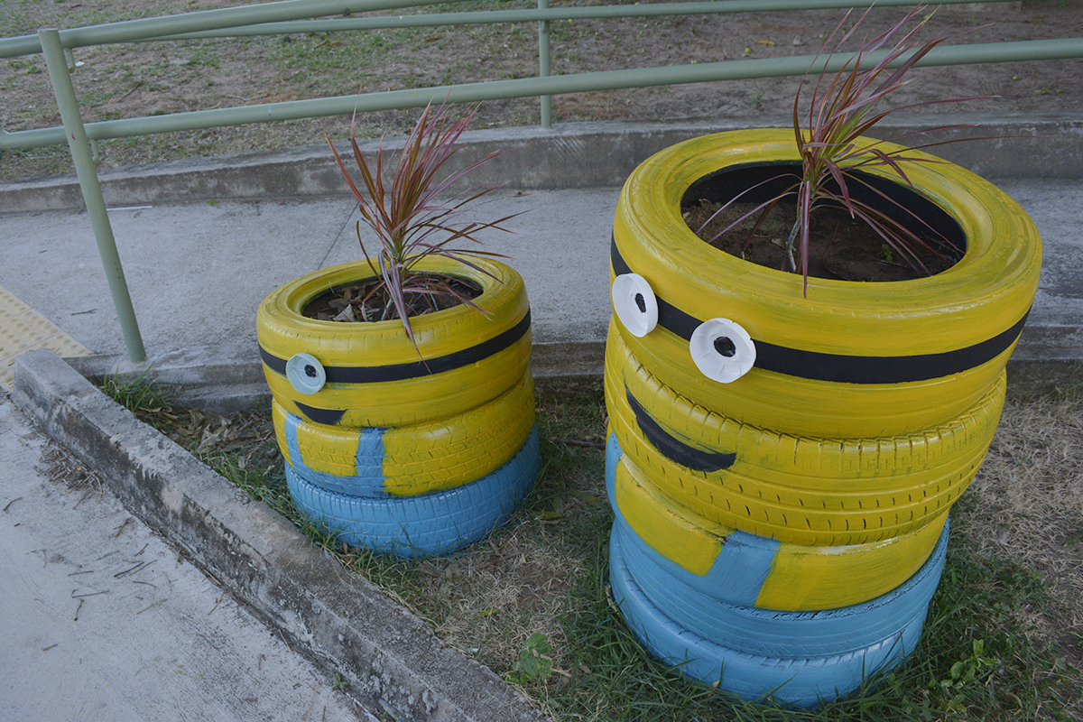 – Mãe, tem um minion ali – se referindo aos Minions feito por pneus no jardim