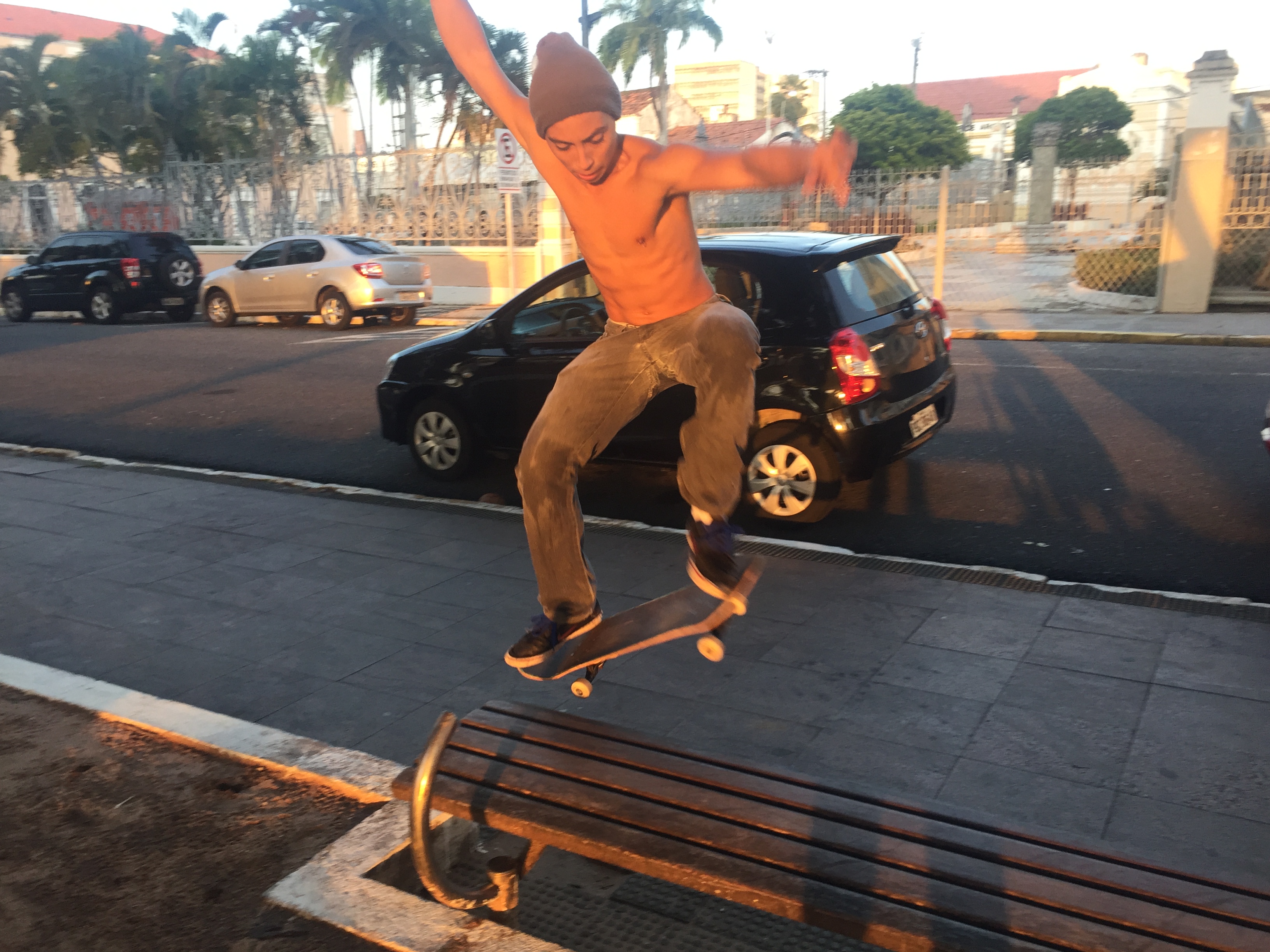 “Aonde for para andar de skate, dá certo para mim”, afirmou. Ele comenta que também vai em outros lugares praticar as suas manobras, como o Presépio de Natal, no bairro da Candelária.