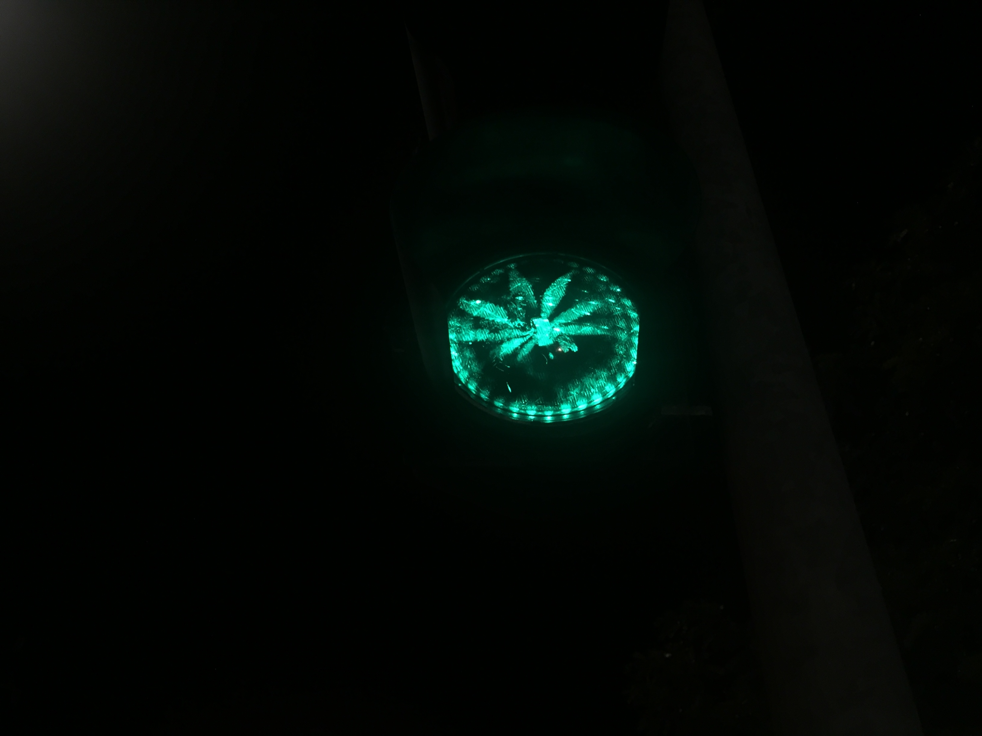 Sim, alguém desenhou uma folha de cannabis no sinal verde do trânsito e já está lá há algum tempo. Como eles fizeram isso?