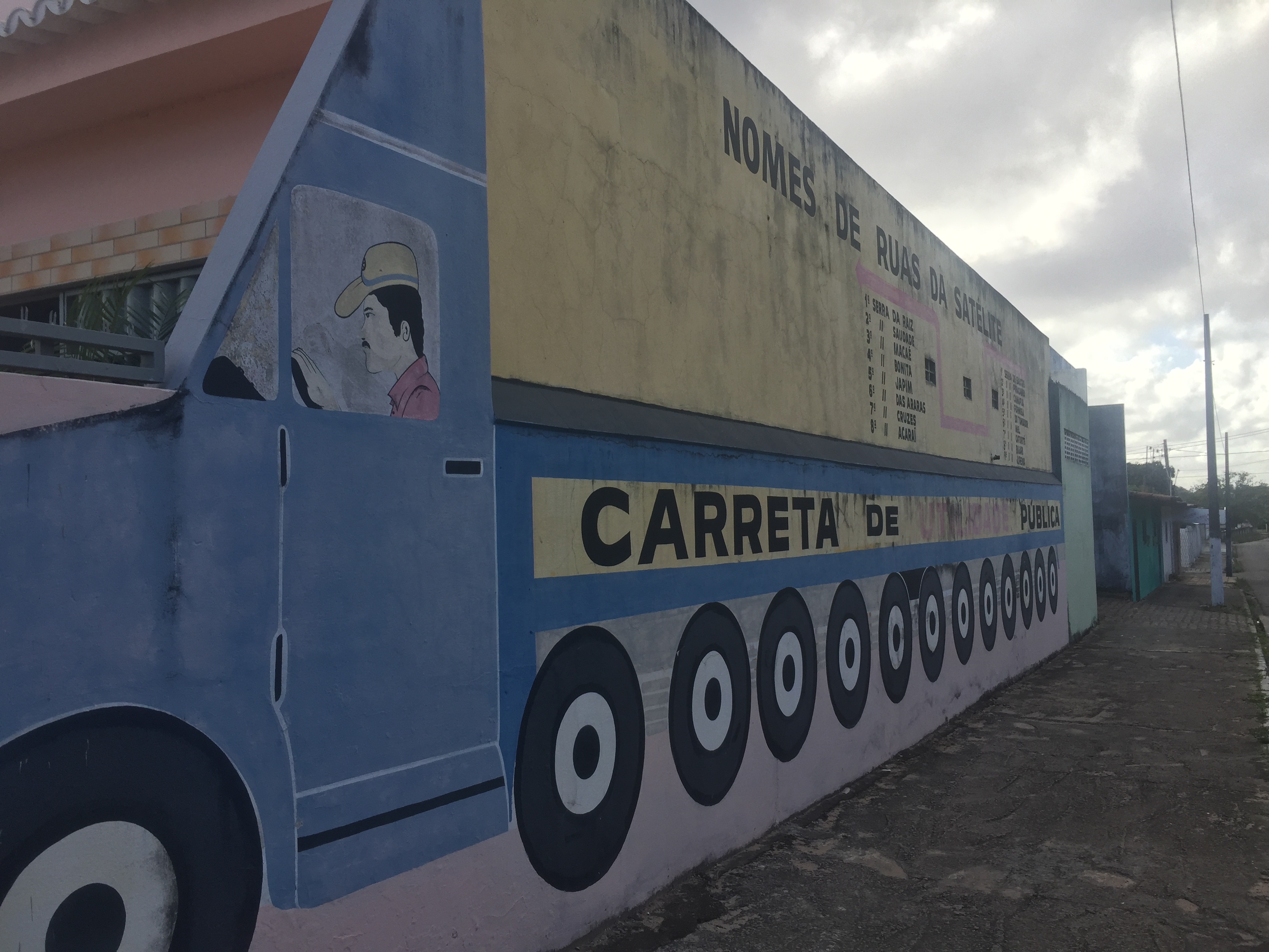 Adalberto, que se orgulha por ter o mesmo sobrenome “que o fundador da cidade do Natal”, percebeu que a lateral da rua onde mora tem um muro em formato de caminhão e criou a “Carreta da Utilidade Pública”, onde desenhou um motorista dirigindo uma carreta, aproveitou o formato da localização do quarteirão onde mora e criou uma mapa interativo para mostrar quais eram as ruas próximas. Vamos dizer que é um infográfico físico.