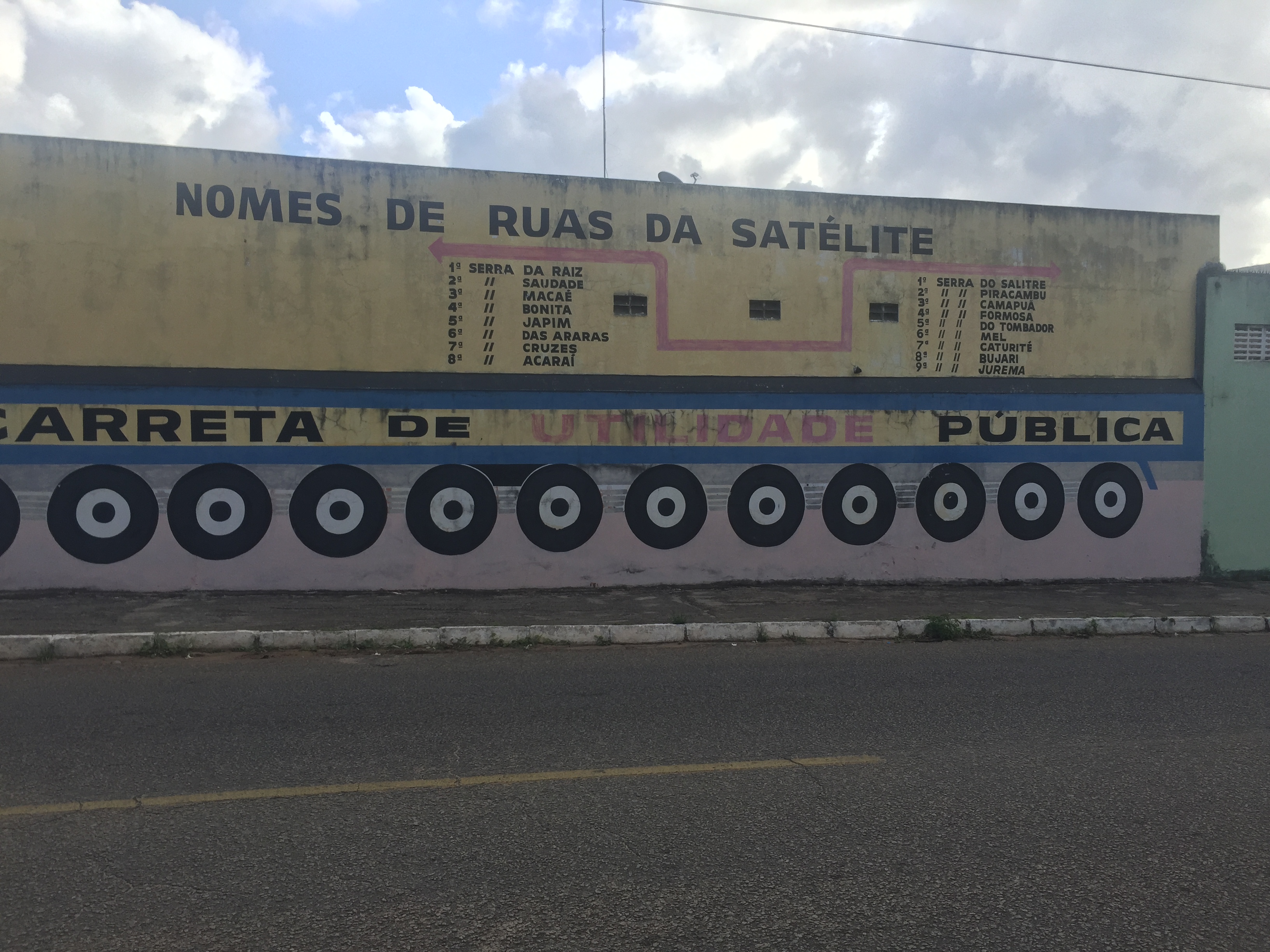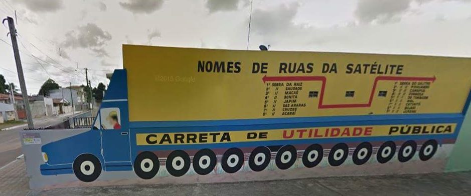 Adalberto, que se orgulha por ter o mesmo sobrenome “que o fundador da cidade do Natal”, percebeu que a lateral da rua onde mora tem um muro em formato de caminhão e criou a “Carreta da Utilidade Pública”, onde desenhou um motorista dirigindo uma carreta, aproveitou o formato da localização do quarteirão onde mora e criou uma mapa interativo para mostrar quais eram as ruas próximas. Vamos dizer que é um infográfico físico.