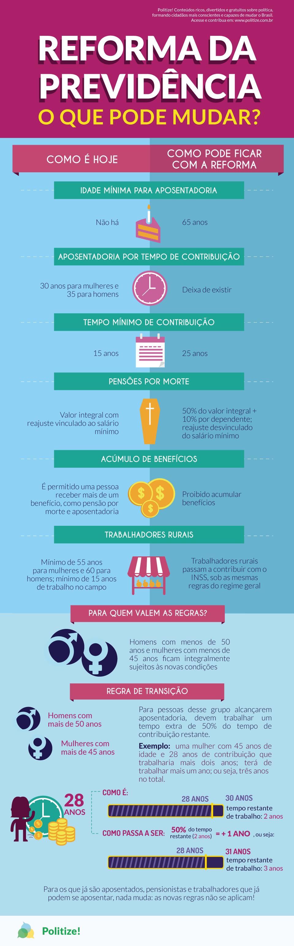 Entretanto, a reforma, inicialmente, exigia que o trabalhador, seja homem ou mulher, contribua durante ao menos 25 anos com o Instituto Nacional de Seguro Social (INSS) e estabelece idade mínima de 65 anos de idade para ter acesso ao benefício. Agora vai haver uma idade específica para homens e mulheres. Vale para os homens que têm menos de 50 anos e para as mulheres com idade inferior a 45 anos (Oi, estou no meio).