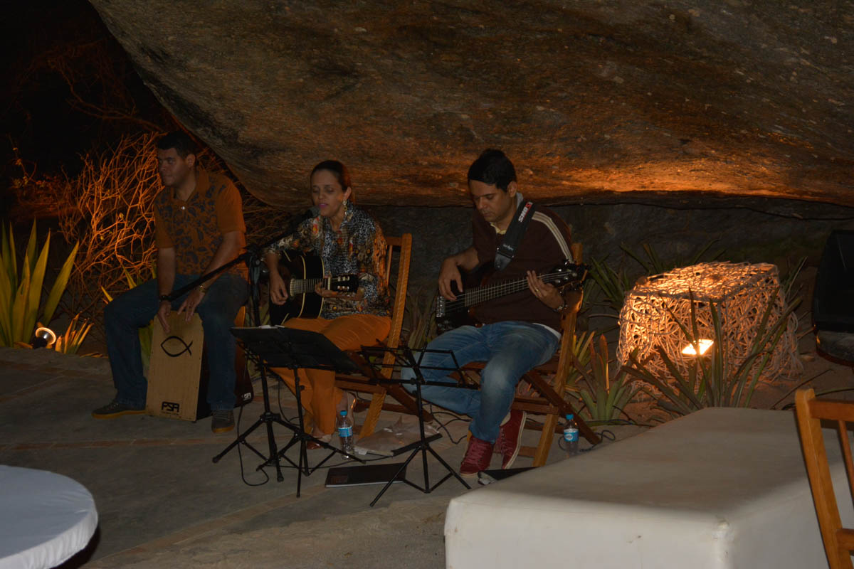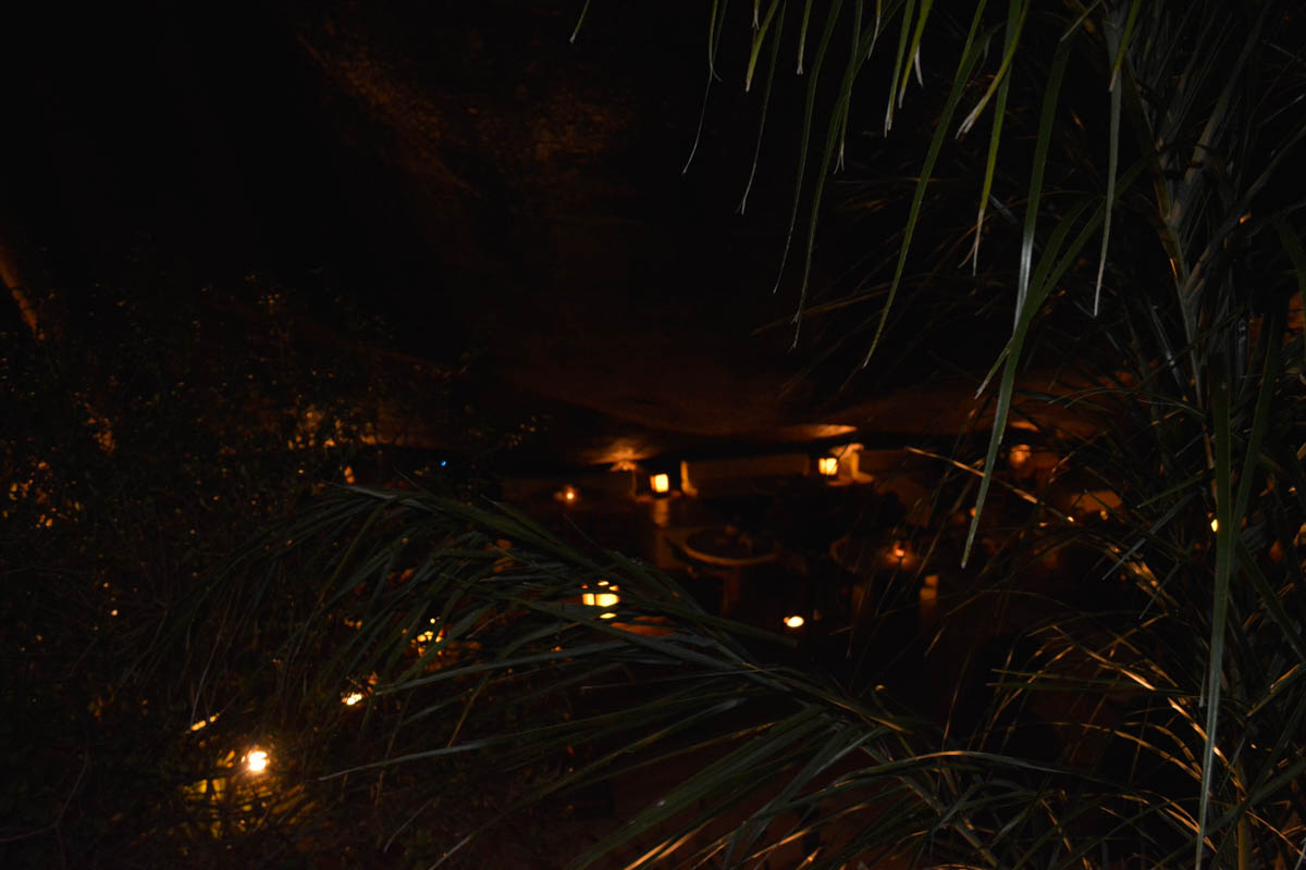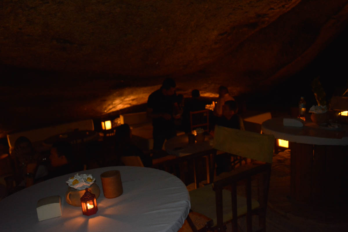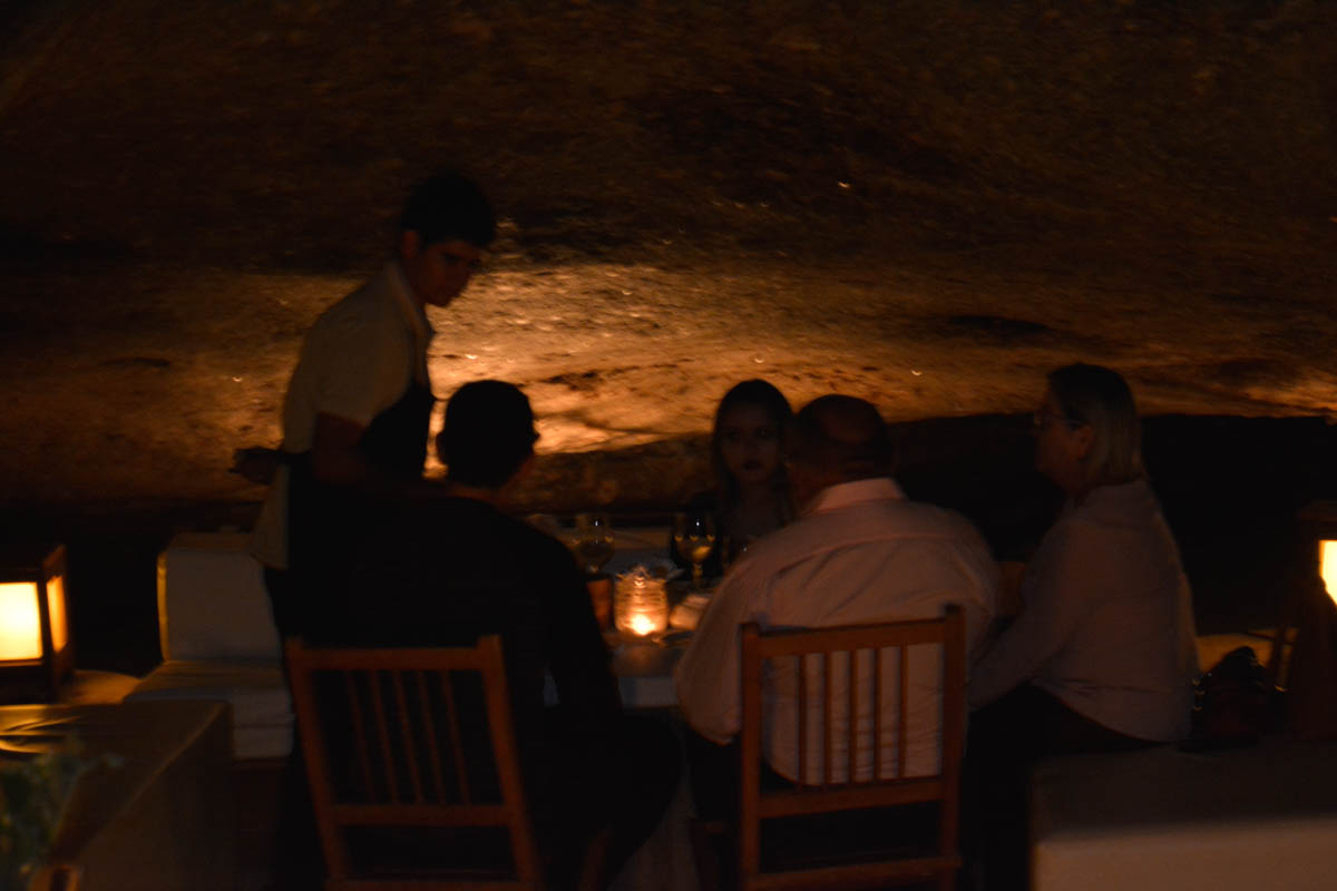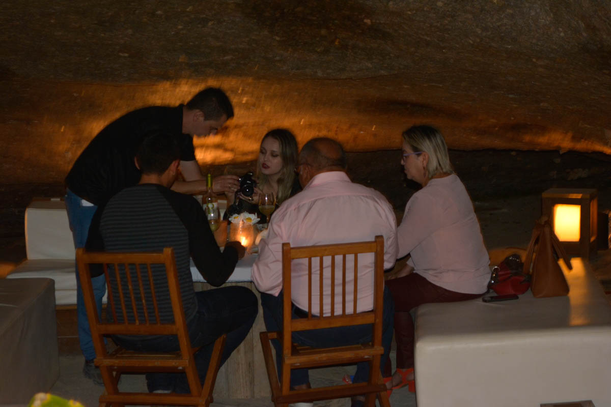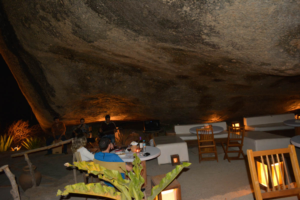 A vontade é ficar tocando o tempo todo na pedra e saber como conseguiram fazer com que um ambiente natural se tornasse um lindo restaurante. As mesas e sofás espalhados ao abrigo da rocha proporcionam um ambiente descontraído para um bom papo. A iluminação baixa ajuda para que a gente sinta o clima intimista do restaurante.