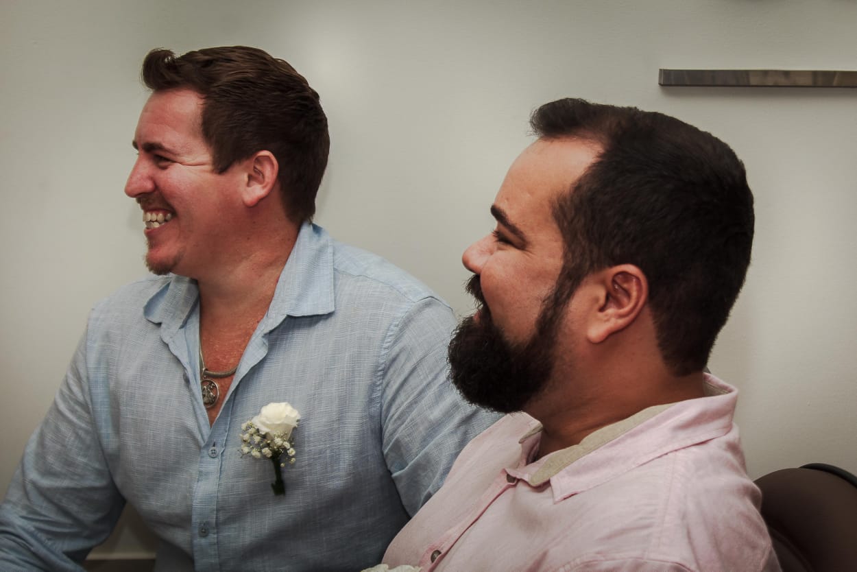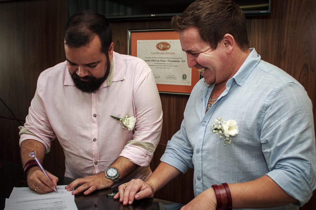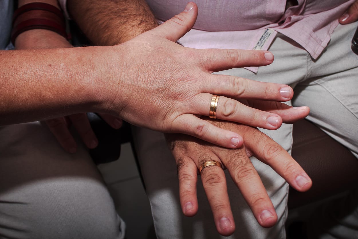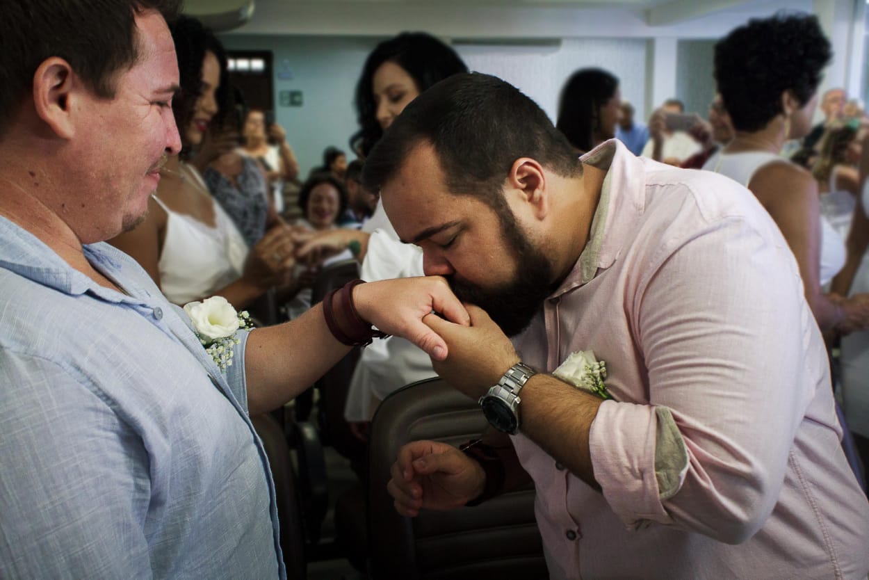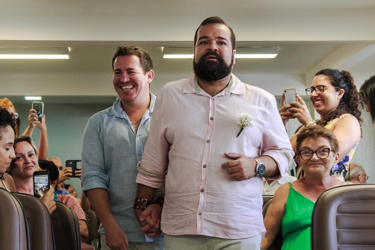 “A ideia de casar surgiu há três anos, quando completamos quatro anos de namoro e liguei para meus pais dizendo que queria ficar muito com o Márcio para sempre, pedindo, assim, a benção deles para casar. Eles prontamente responderam: ‘Se Márcio aceitar, era para dizer que parabenizava a escolha e torcia para nossa felicidade’. Nesse período, a gente sempre sonhou ter um casamento, com planejamento. O nosso real casamento aconteceu com a entrada do Bolsonaro no poder e as constantes ameaças de perda direito à comunidade de LGBT, principalmente pela forte influência da comunidade evangélica. Márcio pediu o casamento enquanto lavara a louça. Por sinal, era aniversário do meu pai e prontamente apoiou essa ideia, principalmente para proteger os nossos direitos”, disse Sidi Schneider.
