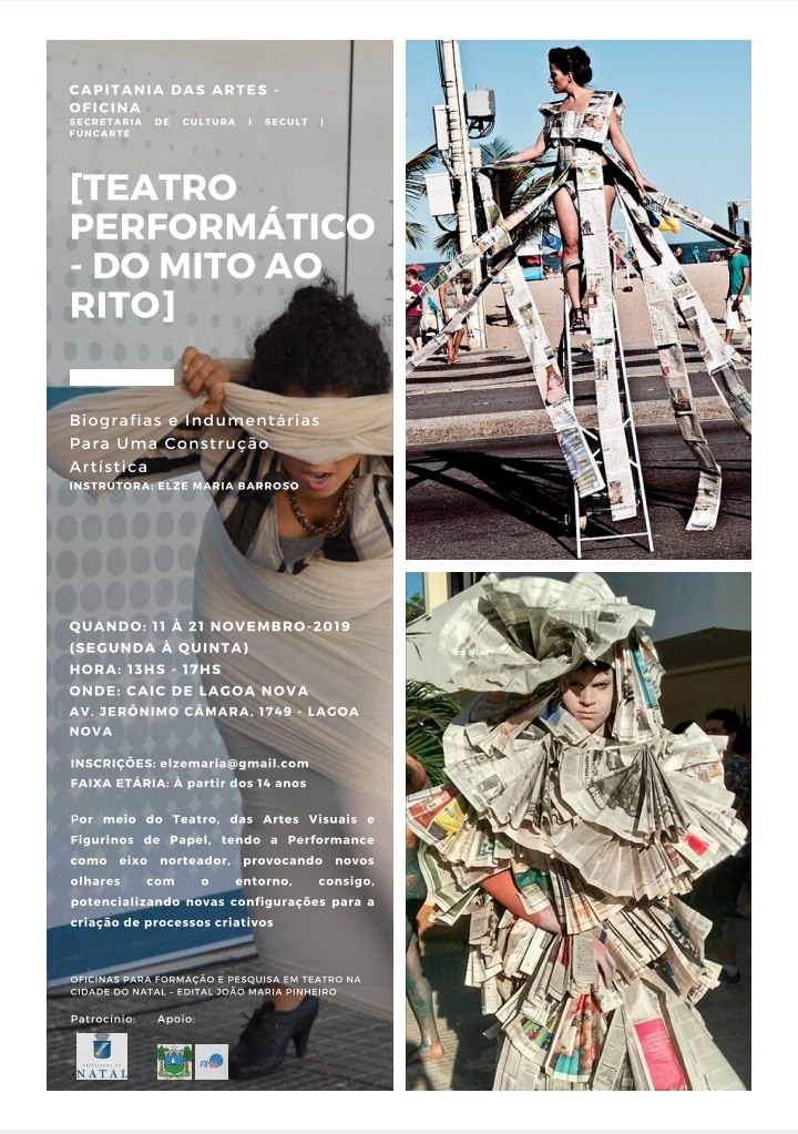 Entre os dias 11 a 14 e 18 a 21 de novembro, de segunda à quinta-feira, das 13h às 17h, no CAIC (Centro Integrado de Apoio as Crianças) de Lagoa Nova haverá uma oficina de Teatro Performático e conta com o apoio do Edital Oficinas para formação e pesquisa em teatro na cidade do natal – João Maria Pinheiro. A proposta da Oficina é experimentar a Performance Arte, através das práticas do Teatro, Artes Visuais e Figurinos de Papel, ampliando as concepções de se fazer arte.
