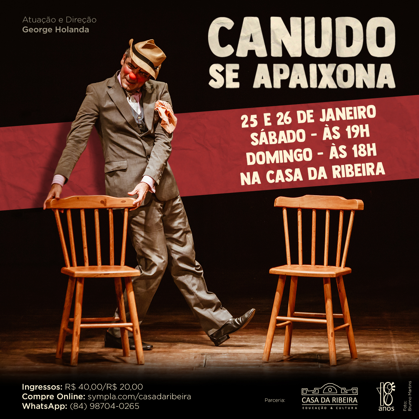 Gosta de palhaços? Uma dica para esse fim de semana é ir ao teatro, mas principalmente valorizar as peças potiguares. Após a estreia em 1º de dezembro de 2019 e da participação no Festival de Palhaçaria “Se Amostra Palhaçada”, no dia 03 de janeiro de 2020, o espetáculo “Canudo se apaixona” retorna aos palcos da Casa da Ribeira nos dias 25 e 26 de janeiro de 2020, sendo que as sessões de sábado começa 19h e domingo começa uma hora mais cedo, às 18h.