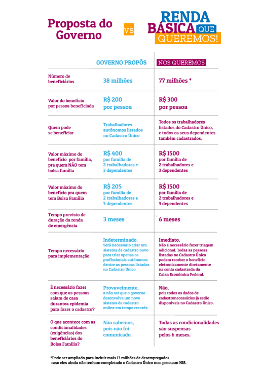 O governo já anunciou a intenção de fazer algo semelhante a isso, mas prometendo apenas 200 reais por mês, por três meses, e limitando-se a um número restrito de profissionais autônomos, sem contar que eles querem fazer isso numa duração de três meses, sendo que o próprio ministro da Saúde, Henrique Mandetta, já disse que o ponto mais baixo da proliferação está previsto para setembro . Além disso, o Governo Federal cortou os benefícios do Bolsa Família, onde os maiores afetados são da região Nordeste, onde tem a principal resistência às ações da presidência.