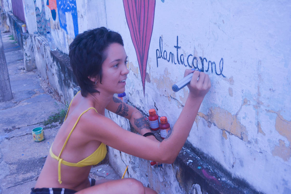 A galera de Natal também apareceu. A Júlia Donati é uma artista e tatuadora que resolveu dar uma contribuição, além de deixar a sua marca na Grande Natal. “Encontrei com Sunsara no Beco da Lama e comentou que faria um evento de Graffiti em Macaíba. Logo me empolguei e como acho importante dominar os espaços urbanos da região Metropolitana, principalmente o graffiti, eu resolvi participar”, disse a jovem.