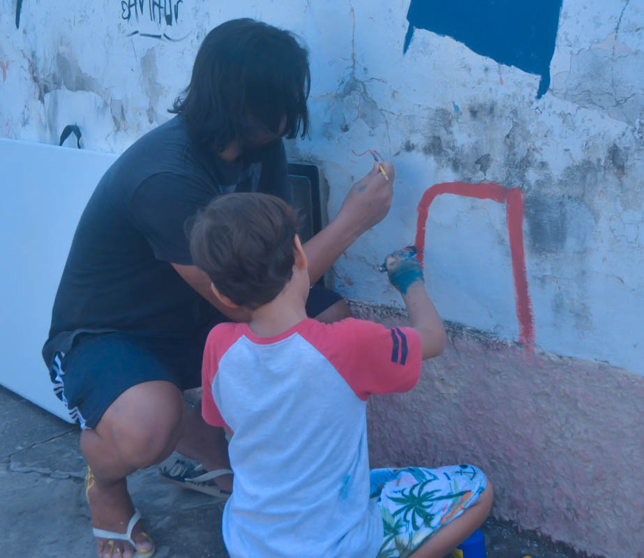 A ação contou com uma participação especial, o Caleb Victor tem oito anos e gosta de desenhar bastante, o dia foi perfeito para pintar as paredes. “Em casa não posso pintar a parede, somente nos cadernos. Amo desenhar e pintar, mas a parte que mais gosto mesmo é pintar”. Ao perguntar quais são suas pinturas, ele rapidamente me chamou e mostrou desenho por desenho. As frases mais comuns eram: “Esse eu fiz”, “Aquele ali coloquei só a marca da minha mão mesmo” e “Aquele ali tive ajuda do meu pai”. Algumas das obras do Caleb podem ser vistas a seguir: