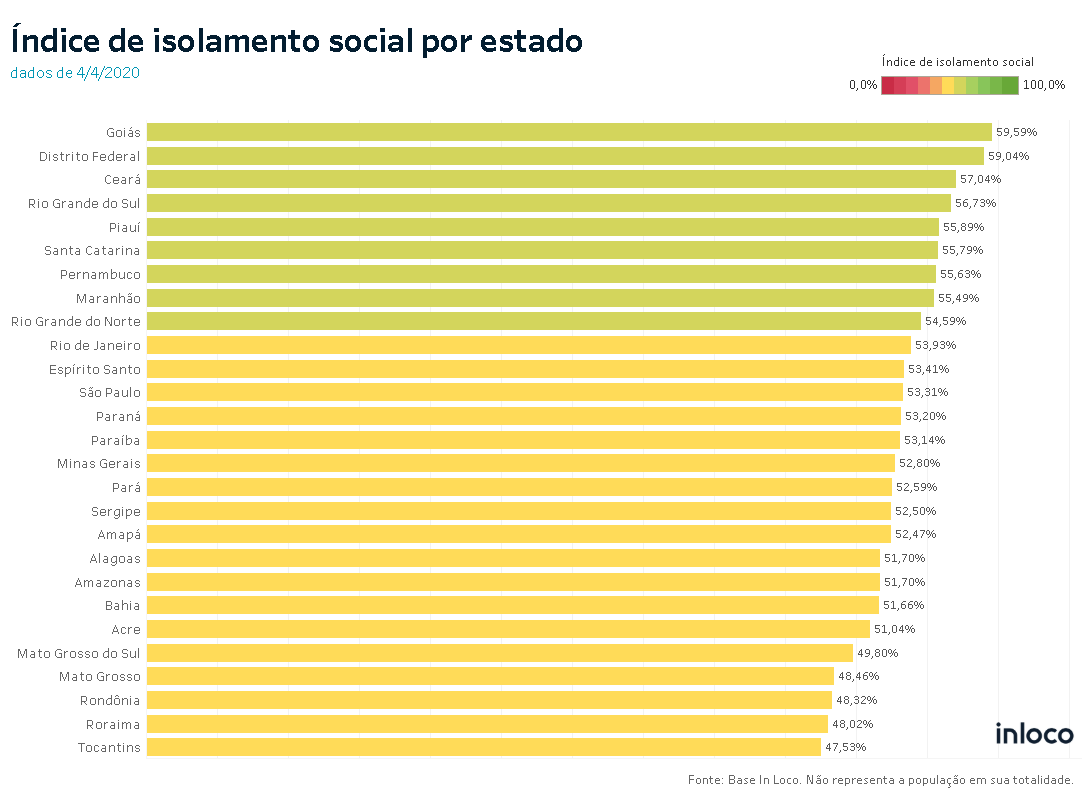 De acordo com a empresa, 53,9% dos brasileiros estão isolados em suas casas, sendo que o estado com maior número é Goías, com um pouco mais da metade da população está em quarentena (59,59%). Em seguida vem o Distrito Federal (59,04%), Ceará (57,04%), Rio Grande do Sul (56,73%) e Piauí (55,89%).