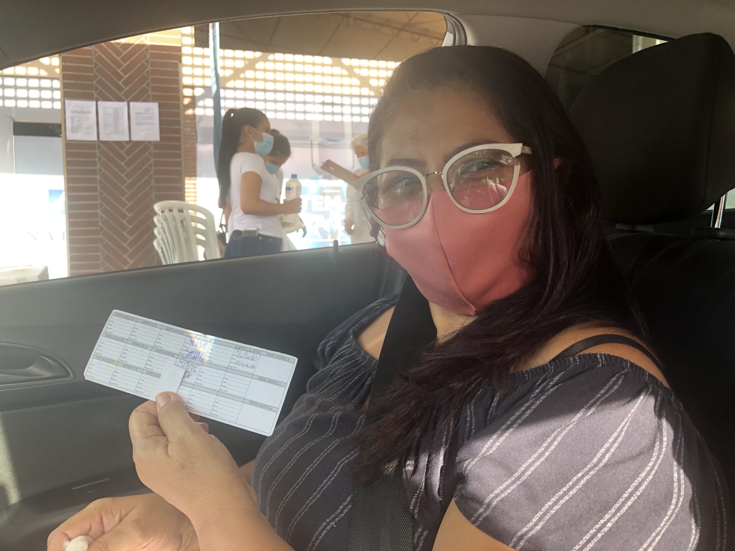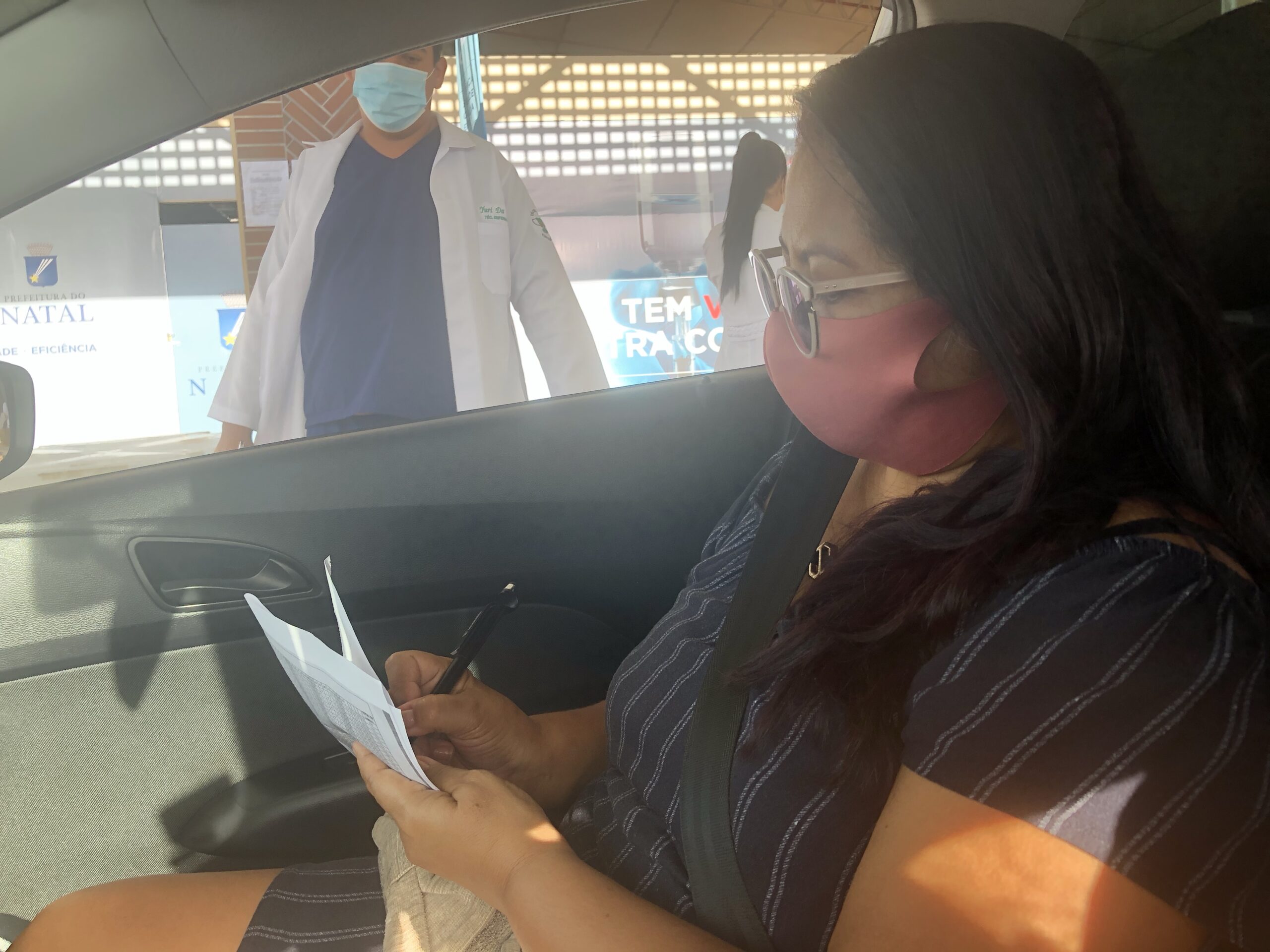 A gente não precisou sair do carro, porque a vacinação em Natal era no sistema drive-thru, assim como foi o exame de teste rápido. Primeiro, ela mostrou o lado impresso e a imagem da escala no edital, mas o profissional a tranquilizou dizendo que o documento mostrava que era profissional da saúde. Apesar disso, ela apresentou a carteira do Coren (Conselho Regional de Enfermagem) e a carteira de vacinação. Entregaram para ela um papel para registrar todos os dados, como nome, sobrenome, CPF, RG, área de trabalho e entre outras atividades.