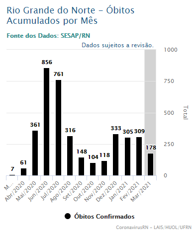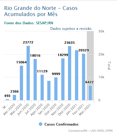 Março não só somente tem por analogia apenas com o mês que começou a pandemia, como também está associado a um dos períodos da história da doença no RN. Por exemplo, se comparar Março 20 e Março 21, similarmente, os números de casos são bem superiores. Enquanto no ano passado foram 493 doentes e neste mês, até o momento estão 6422.