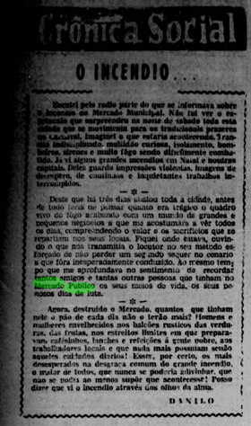 Na madrugada de sábado para domingo aconteceu um grande incêndio destruiu o Mercado Público Municipal, localizado na Avenida Rio Branco, no bairro Cidade Alta, zona Leste de Natal. Na época, Natal não havia supermercado e os mantimentos eram comprados neste mercado público. Por isso, lá vendia todos os produtos possíveis e impossíveis de se imaginar.