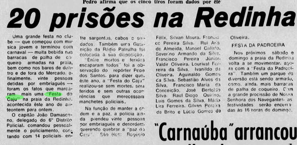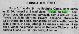 Era lá que os adultos se divertiam e os adolescentes paqueravam. Tanto que as pessoas associavam que janeiro era sinônimo de Festa do Caju. Acontecia no Redinha Clube, que era uma casa próximo da Igreja de Nossa Senhora dos Navegantes.