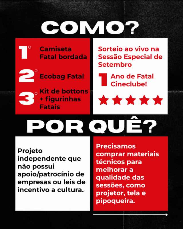 Sendo assim, será no Cine Fatal Especial de 1 ano que irá ocorrer o sorteio dos itens da Rifa Fatal, campanha destinada para a compra de materiais técnicos de exibição, o primeiro sorteado irá ganhar uma camiseta Fatal bordada, o 2°, a Ecobag Fatal, e o 3°, um Kit de bottons + figurinhas Fatais.