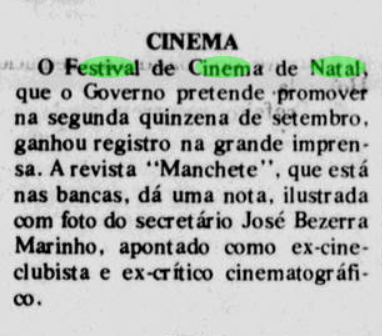 Por falar no ano de 1987, este foi o primeiro ano do festival. A ideia veio do crítico de cinema da cidade, Valério Andrade e contou com apoio do Governo do Estado e Prefeitura do Natal. Além da exibição, o espaço recebia grandes artistas nacionais que vinham conversar sobre a sua carreira e receber homenagem dos artistas locais.