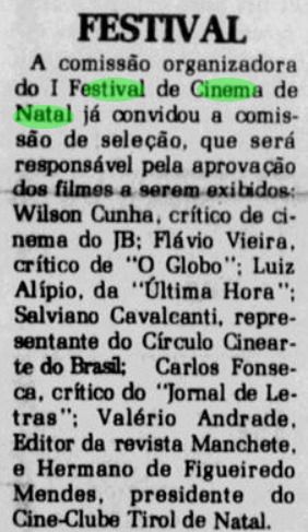 Os primeiros filmes do festival foram “A Fonte da Saudade”, de Marco Alteberg, “Ele, o Boto” e “A Guerra do Paraguai”. A exibição aconteceu no Centro de Convenções de Natal, na Via Costeira. Mas, antes, houve um coquetel de lançamento no Rio de Janeiro para promover o evento potiguar e contou com presença de atores de novela como José Lewgoy.