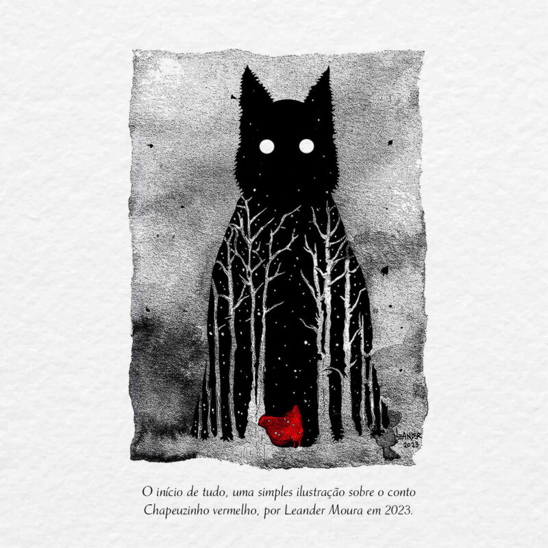 A obra nasceu de uma ilustração inspirada em Chapeuzinho Vermelho, criada por Leander Moura em 2023.