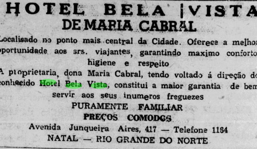 No ano de 1947, o hotel passou a administração da Maria Cabral, onde mostrou que a hospedagem era “de família”.