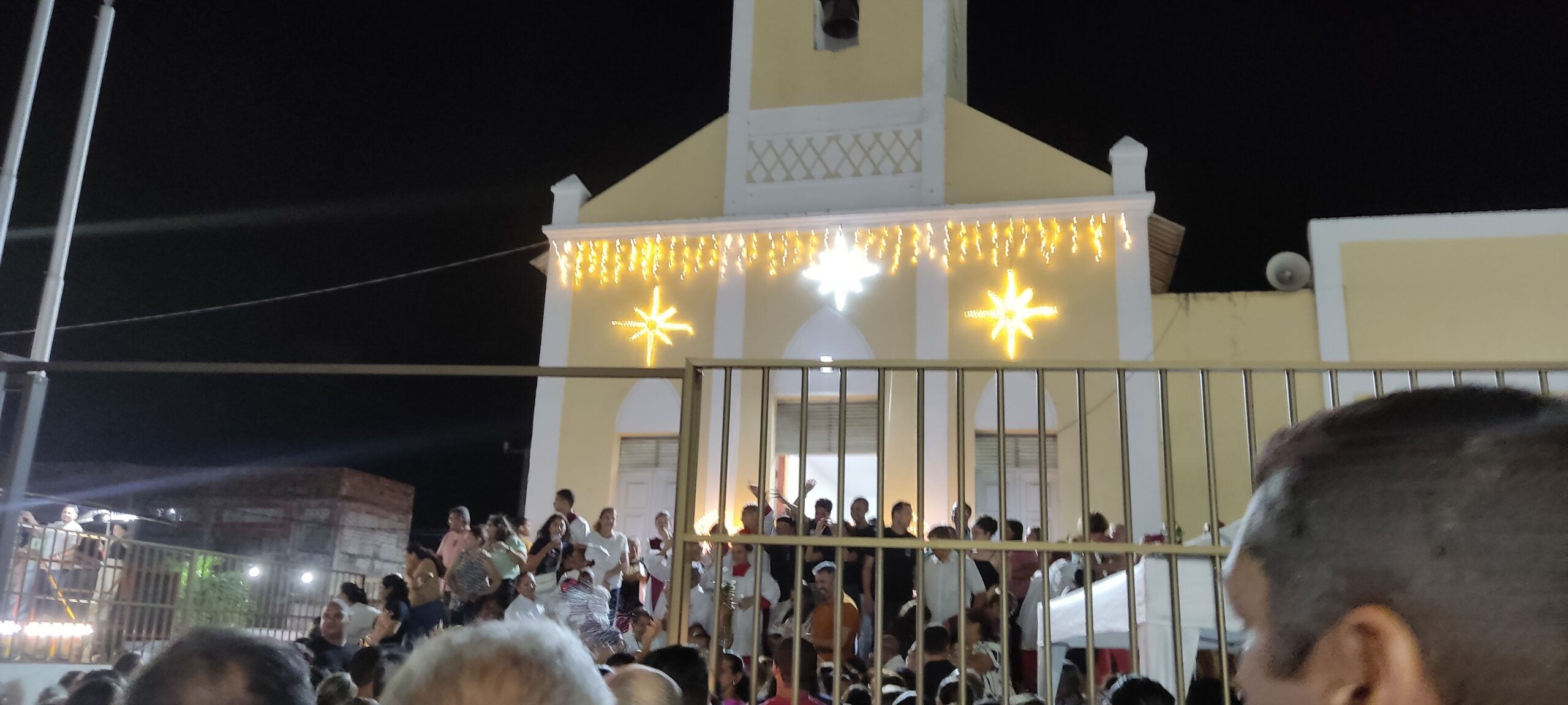 Após a missa acabar, rapidamente o cantor apareceu no palco cantando suingueira. Era o cantor Dinho Costa que com seu rebolado e carisma fez todo mundo parar em frente ao palco e assistir ao show.
