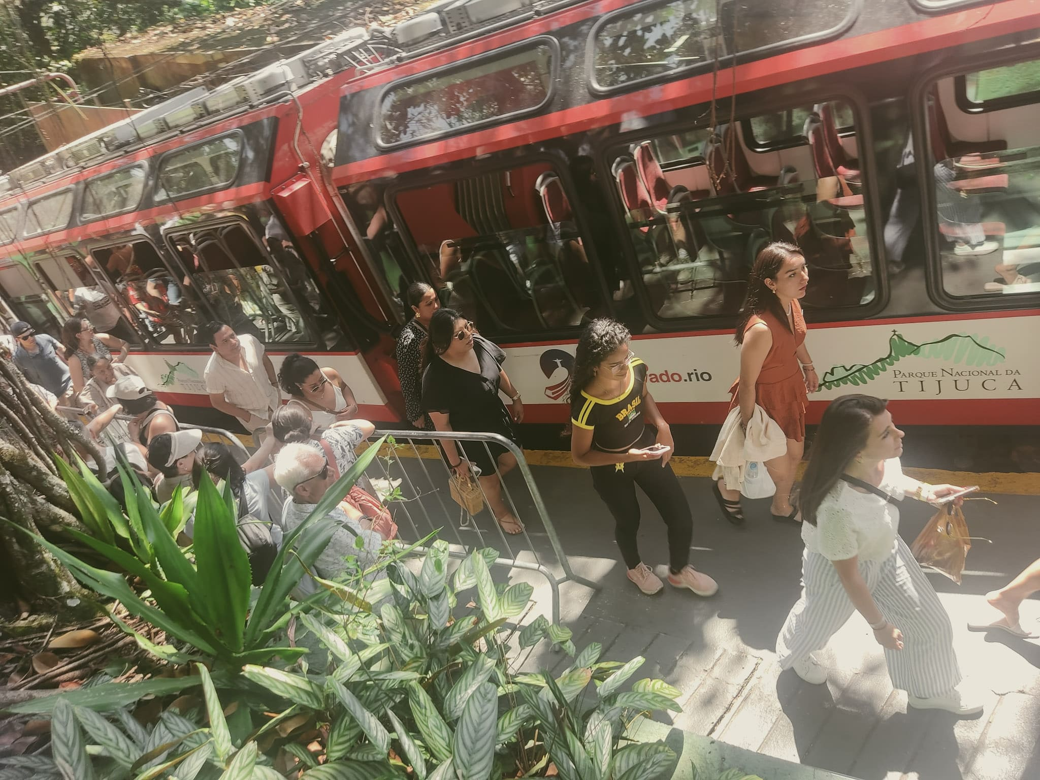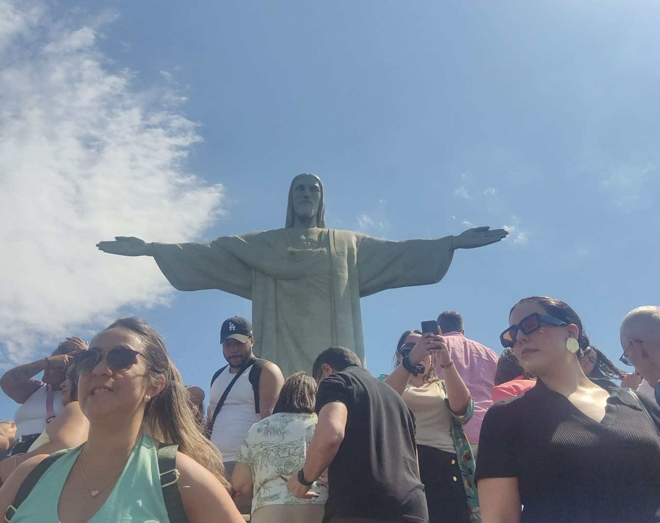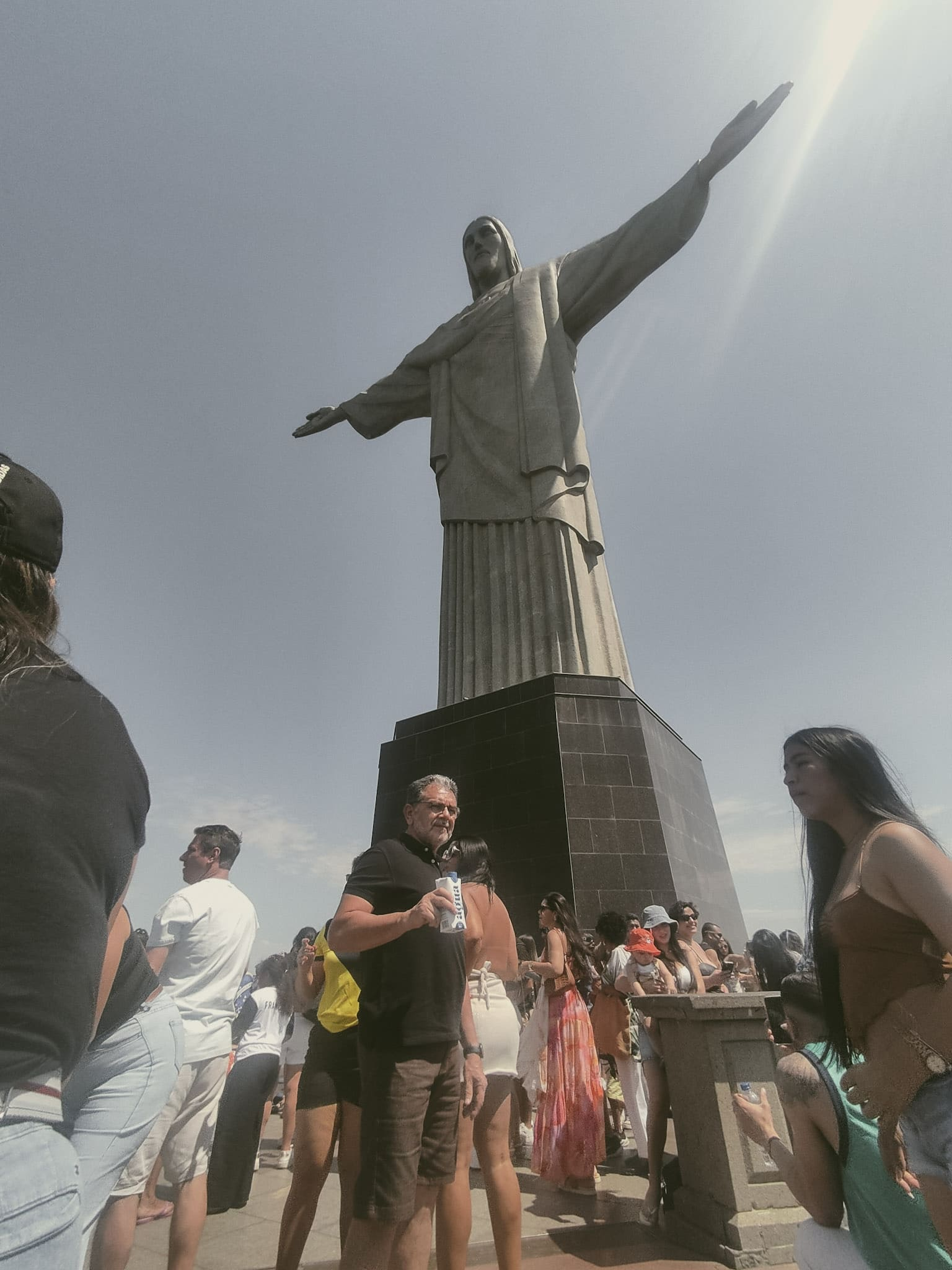 Ao chegar no topo, nos deparamos com a multidão de visitantes que disputavam, sem pudor, o melhor ângulo para a foto. Era um verdadeiro espetáculo de pessoas se atravessando, invadindo os registros alheios, em busca daquela imagem perfeita diante da imponente estátua. Mesmo com toda a confusão, conseguimos garantir nossas fotos e, principalmente, apreciar a vista do mirante: uma paisagem de 360 graus do Rio de Janeiro, em que mar, montanhas e prédios se fundem num horizonte inesquecível.